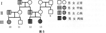 在一个远离大陆且交通不便的海岛上,居民中有66%为甲种遗传病(基因为A、a)致病基因携带者。岛上某家族系谱中,除患甲病外,还患有乙病(基因为B、b),两种病中有一种为血友病,请据图5回答问题:
