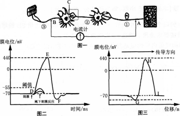 (1)图一中,虚线部分示意的结构为__________,C处一般是神经元的__________部分的细胞膜,该膜上发生的信号转换为__________。若先刺激①神经元,电流表指针偏转__________次,再刺激②神经元,电流表指针偏转__________次,由此说明兴奋在两个神经元之间的传递是__________的。(6分)(2)由图二分析可知,若D点受到的刺激为阈下刺激,与阈上刺激相比,Na+内流量__________,(能.不能)介导细胞产生动作电位。(3分)(3)轴突膜处于HI段状态时,__________离子通道大量开放,与图二中__________段膜电位状态相同。(6分)