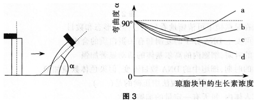 某研究小组探究避光条件下生长素浓度对燕麦胚芽鞘生长的影响。胚芽鞘去顶静置一段时间后.将含有不同浓度生长素的琼脂块分别放置在不同的去顶胚芽鞘一侧,一段时间后测量并记录弯曲度(仅),如图3。左图为实验示意图,右图曲线中能正确表示实验结果的是( )。