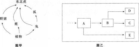(3)图乙是能量流经东北虎种群的示意图,其中A表示东北虎的摄入量,B表示东北虎的同化量。那么D、E依次表示东北虎的__________,__________。(4分)