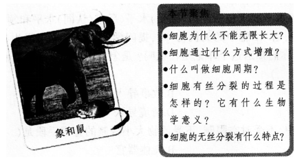 “细胞增殖”是人教版高中生物必修一第六章第一节的内容。如下左图为教材中“问题探讨”栏目的图片,请以此为素材,设计一个新课导入环节。如下右图为教材中“本节聚焦”栏目中的内容。请以此作为参考.并结合教材,确定本节课的教学目标以及教学重难点。