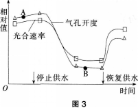 某植物在停止供水和恢复供水条件下,气孔开度(即气孔开放程度)与光合速率的变化如图3所示。