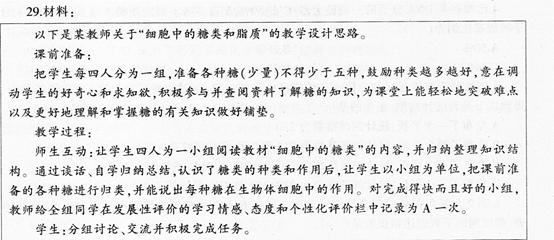 (1)该教师在教学设计中主要使用了合作学习的教学策略。在运用合作学习教学策略时,需要注意的问题有:必须有足够的空间和时间;学生必须经过训练及练习,才能有效地进行,每个学生都要积极参与,否则会有形无实;并不是所有的教学活动都适合以合作学习的方式来进行,合作学习既有优点,也有缺点,要注意扬长避短。 (2)可采用的教学策略有: ①概念图教学策略。概念图能以简练的形式展示所要教的重要概念(糖类和脂质的种类、功能)和原理原则,它的层级结构可以使教学材料得到有效组织。同时,在概念图的绘制过程中,学生可以由被动学习转为主动学习。另外,教师还可以利用概念图评测学生对概念理解的程度。 ②直观教学策略。糖类和脂质的类型众多,与我们的生活息息相关。教师可以利用一些直观的材料,如实物、图像等进行教学。这样在丰富学生的直接经验和感性认识的基础上,使学生经历感性认识到理性认识,从形象思维到抽象思维的转变。