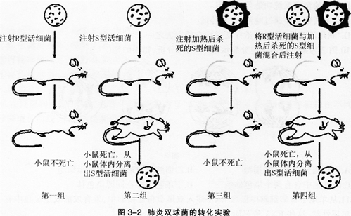 格里菲思从第四组实验的小鼠尸体上分离出了有毒性的S型活细菌,而且这些S型活细菌的后代也是有毒性的S型细菌.这表明无毒性的R型活细菌在与被加热杀死的S型细菌混合后,转化为有毒性的S型活细菌,而且这种性状的转化是可遗传的。于是,格里菲思推论在第四组实验中。已经被加热杀死的S型细菌中,必然含有某种促成这一转化的活性物质——“转化因子”,这种转化因子将无毒性的R型活细菌转化为有毒性的S型活细菌。