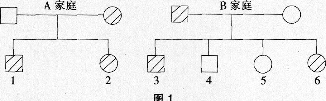 图1是 A、B两个家庭的色盲遗传系谱图,A家庭的母亲是色盲患者(图中