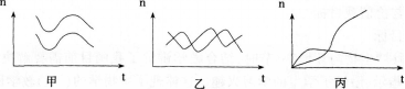 下列三幅图分别表示两种生物种群随时间(t)推移而发生的数量(n)变化。那么,甲、乙、丙三幅图表示的关系依次是( )。