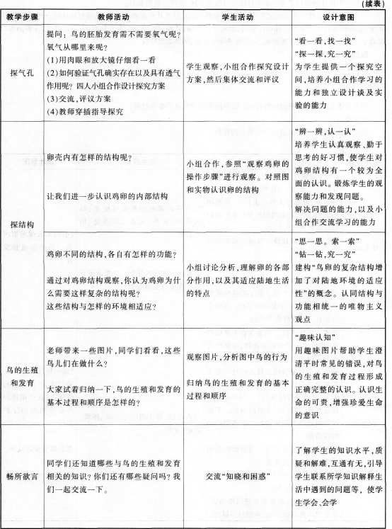 《义务教育生物学课程标准(2011年版)》关于“鸟的生殖和发育”的具体内容要求是:知道鸟的生殖和发育的过程。某节教材内容通过提出问题展开讨论,然后观察鸡卵的结构,最后通过利用学生已有的知识,更加清晰地知道鸟类生殖和发育的过程。 (1)设计本节课的教学重、难点。(10分) (2)设计一个学生自主探究、合作学习的教学过程。(20分)