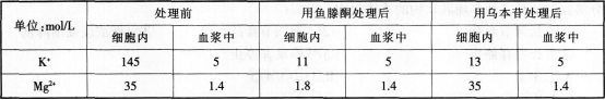 下表是人体成熟红细胞中与血浆中的K+和Mg2+在不同条件下的含量比较,据表分析错误的是( )。