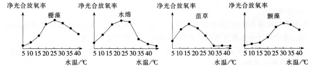 (1)栅藻、水绵、菹草 (2)菹草;颤藻 (3)栅藻密度过大导致栅藻接受光照不足 解析: (1)栅藻、水绵、菹草均属于真核生物,而颤藻属于原核生物。真核生物中的植物细胞中含有叶绿体.但是颤藻不含叶绿体。 (2)图中可看出,菹草在15℃时出现生长高峰,而其他生物出现生长高峰所需的温度均比较高.所以一年中最早出现生长高峰的生物可能是菹草;夏季高温阶段最具生长优势的生物可能是颤藻,其最适生长温度为30℃左右,其他均低于此温度。 (3)题干中提出,两组实验条件的唯一差别是8组接种栅藻的浓度明显高于A组,并且实验在短时间内完成,因此主要原因是栅藻之间会相互遮挡阳光,而每个栅藻都要进行呼吸作用,从而导致净光合速率下降.造成B组栅藻净光合放氧率低。
