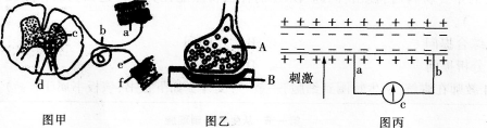 (1)图甲中f表示的结构是___________,图乙是图甲中——(填字母)的亚显微结构放大模式图,图乙中的B是下一个神经元的___________。(3分)(2)缩手反射时,兴奋从A传到B的信号物质是___________。兴奋能由B传到A吗并给出原因___________,___________。(6分)(3)图丙是图甲的一段,如图所示,如果在电极a的左侧给一适当刺激,此时a、b之间会产生电流,其方向是___________;电流计c的指针会发生___________次方向___________(相同或相反)的偏转。(6分)