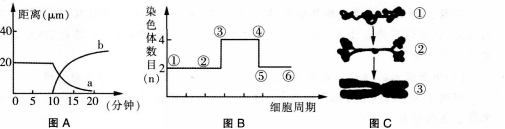(1)分别移向两极的染色体着丝点之间的距离 (2)10;②③;4n (3)①②;前期; 解析: (1)图A中曲线a表示染色体的着丝点与纺锤丝的相应极之问的平均距离.结合染色体在细胞分裂过程中的行为特征,可推知曲线b表示分裂后期染色体之间的距离。 (2)由图A可知10分钟后细胞分裂进入后期,相当于B图中的②③段。有丝分裂后期细胞中染色体数目最多,依据图示可知为4n。 (3)图c中①~②为DNA复制时期,对应图B的①②,图c中②~③染色质变成染色体,该变化发生在有丝分裂的前期,①是染色质、③是染色体,两者是同一种物质在不同时期的两种存在状态。