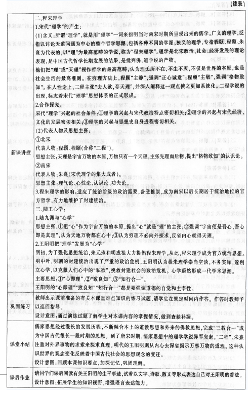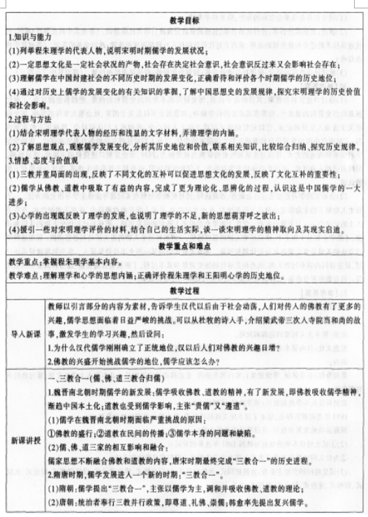 根据下列材料设计教学片段。 (1)《普通高中历史课程标准(实验)》规定:列举宋明理学的代表人物,说明宋明时期儒学的发展。 (2)课文摘录: 隋朝儒学家提出“三教合归儒”的主张,又称“三教合一”,主张以儒学为主,调和并吸收佛教、道教的理论。唐朝统治者奉行三教并行的政策,即尊道、礼佛、崇儒。佛教和道教的发展,开始挑战儒学的正统地位.儒学大师韩愈率先提出复兴儒学。 程朱理学适应了统治阶级的政治需要,备受推崇,成为南宋以后长期居于统治地位的官方哲学.有力地维护了封建****统治。朱熹编著的《四书章句集注》,成为后世科举考试依据的教科书。朱熹的学术思想还传及日本、朝鲜乃至欧洲;在日本和朝鲜,甚至形成“朱子学”学派。 要求:根据课程标准要求和课文内容,设计出相关的教学过程,包括教学环节、教师活动和学生活动,并说明设计意图。