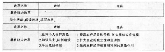 教师活动:展示赫鲁晓夫改革内容的表格(从政治和经济两个角度).请学生阅读教材.完成表格.