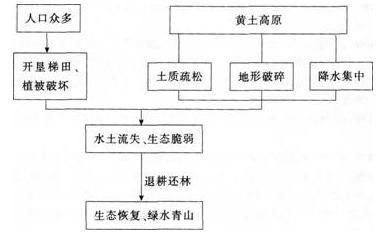 下面是对我国黄土高原地理环境特征的一些描述,如水土流失、人口众多、退耕还林、降水集中、开垦梯田、植被破坏、生态恢复、土质疏松、地形破碎、生态脆弱、绿水青山等。 问题.(1)根据上述描述.用纲要信号方式(文字、线条或箭头等)绘制黄土高原地理环境特征变化过程的逻辑关系图。(6分) (2)简要说明运用该图进行教学的意义。(6分)