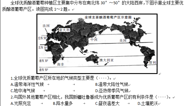 ①存在的共同问题:两个题目均有两个选项为正确答案,但是该老师设计的是单项选择题。②可以将第二个题目的选项该为A.光照充足,昼夜温差大 B.降水丰富 C.地形平坦 D.土壤肥沃
