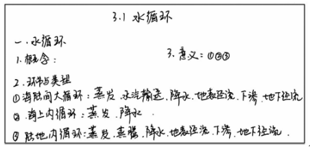 张老师运用传统教学方式讲授“自然界的水循环”,形成的板书如下图:
