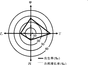 根据下图为“某国甲、乙、丙、丁四个时期人口增长模式示意图”。