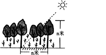 根据某地是我国重要的人工多层经济林区。下图为该地某日太阳处在最高位置时的示意图.此时北京时间为12:40,树影遮挡地被植物的面积在一年中达到正午时的最大。 该地位于( )。