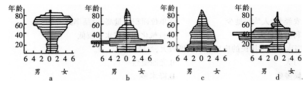 下图所示为某发达国家四城市人口的年龄、性别结构示意图,人口的年龄、性别结构受人口迁移影响明显的一组城市是()。