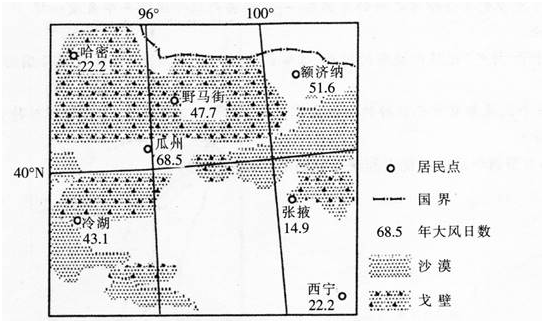 2009年5月,甘肃酒泉有“陆上三峡”之称的1000万千瓦级风电基地建设项目获国家批准,其中的80%集中在被称为“世界风库”的瓜州县。下图示意瓜州等地年大风(≥8级)日数。