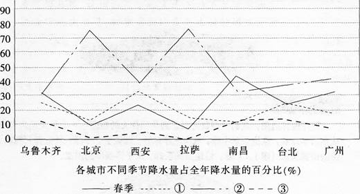 下图是我国主要城市不同季节降水相对值折线图 对下列城市降水特征的判断,正确的是( )。