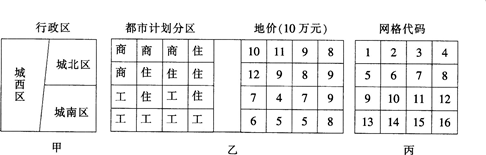 根据下图中的甲示意某城市行政边界的划分资料,该区有3个行政单元,分别为城西区、城北区和城南区。乙示意该地区都市计划分区与地价的网格式资料,丙是网格代码。人口统计资料显示城西区有12000人、城北有19000人、城南区有15000人;已知甲都市计划分区人口依土地利用类型(商业、住宅、工业),按3:5:2的比例而定(同一土地利用类别每一方格人口数量相等)。