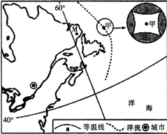 根据某圆形区域内由四条两两相互对称的等温线组成的图,因其极像古代的钱币,被称为古币型等温线图。下图为某陆地沿海洋流及其附近某海区古币型等温线分布图, 图中由a、b、c、d四条等温线组成了一个古币型等温线图,a,b、 C、d四条等温线中能代表甲所在海区的是( )。