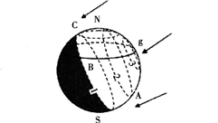 根据下图为北半球夏至日某时地球光照示意图,图中的虚线圆圈1、2、3表示太阳高度等值线,其上的太阳高度分别为0°、30°、60°;g为太阳直射点,A点经度为120°E。 此时新一天占全球的比例为( )。