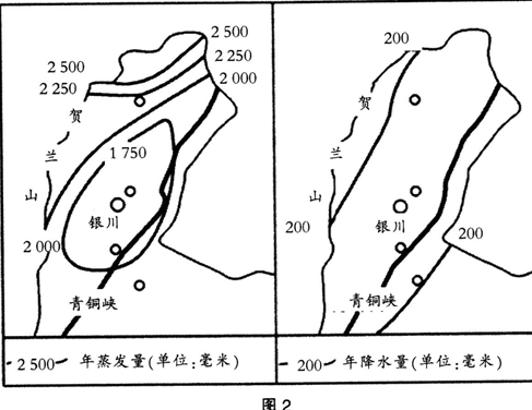 材料一100多万年前的第四纪更新世时期,银川平原是一个由断陷盆地形成的浩瀚大湖。直到黄河形成,沧桑巨变,逐渐出现冲积湖积平原。平原顺黄河流向,自西南向东北倾斜,其中银川一带是平原的沉降中心,地势低洼。银川湖泊湿地众多,一个众所周知的说法便是“七十二连湖”,而这些湖沼和引黄灌溉区的开发有很大关系。图1示意银川平原湿地分布,图2示意银川附近址.区年蒸发量和年降水量分布。