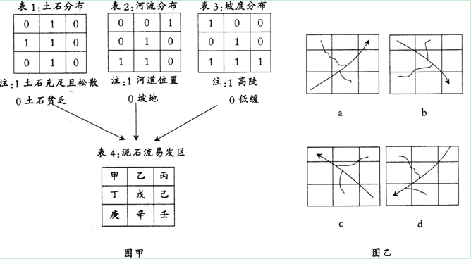 某市泥石流易发生在下列三项条件都同时具备的地方:(1)河道;(2)陡坡;(3)大量松散土:石分布。该市的地理信息经数字化后,处理分析得出表4,如图甲。 该市易发生泥石流的区域是( )。