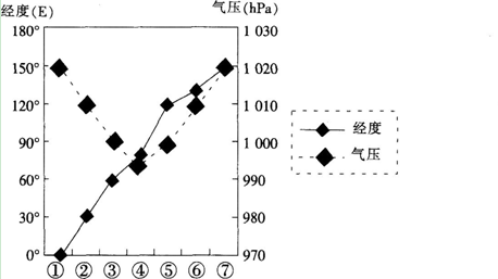 下图为“某月北纬31。纬线上①~⑦7个地点的气压分布图”。