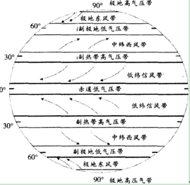 绘制全球气压带风带分布示意图,标明界限及位置,并说明其在地理教学中的作用。
