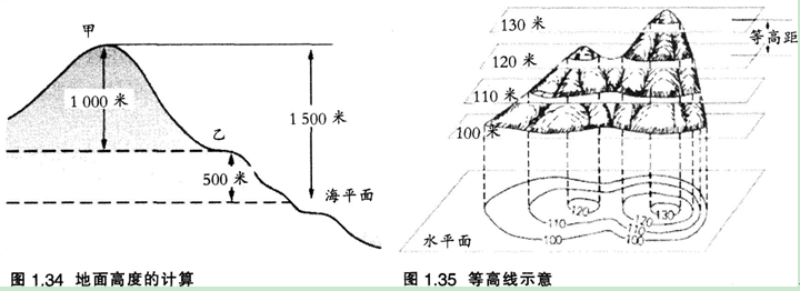 地面某个地点高出海平面的垂直距离,叫作海拔。某个地点高出另一个地点的垂直距离,叫作相对高度。例如,图1.34中,甲地的海拔为1500米,乙地海拔为500米,甲乙两地的相对高度为1000米。