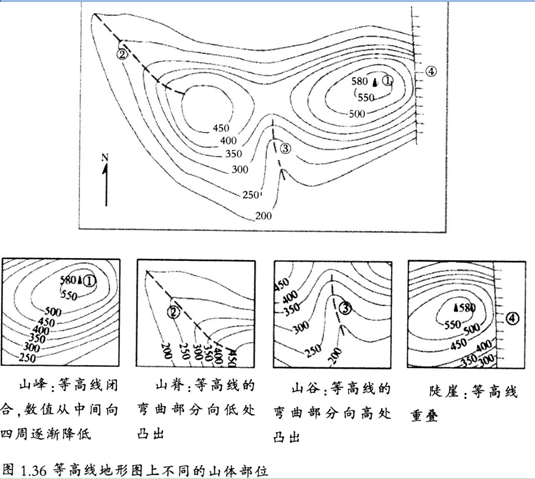 在等高线地形图上,可以判断坡度的陡缓,坡陡的地方,等高线密集;坡缓的地方,等高线稀疏。通过等高线的特征,还可以识别山峰、山脊、山谷和陡崖等常见的地形部位。