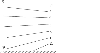下图为对流层大气某要素等值面垂直分布图. 若a.b、c、d,e为不同气压值,则甲、乙、丙、丁四地的气流运动方向是( )。