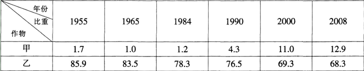 读我国甲、乙两类作物在我国种植面积比重变化表(单位:%) 从甲、乙作物播种面积的变化可推测( )。