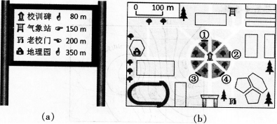 下图(a)为某校地理小组设计的校园景观指示牌,下图(b)为校园图局部.读图.回签第下题。