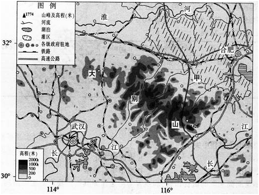 (3)分析甲高速公路施工难度大的原因,概述该公路对大别山区社会经济发展的影响。(4分)