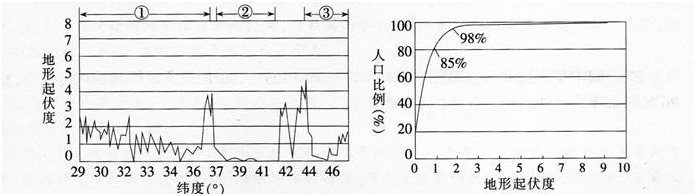 地形起伏度是指在一个特定的区域内,最高点与最低点海拔高度的差值(数值为相对值,数值越大表示地形起伏越明显)。下面两图分别为“我国沿某经线的地形起伏度”和“我国不同地形起伏度上人口的累积分布”示意图. 下列关于我国人口分布的叙述,正确的是( )。