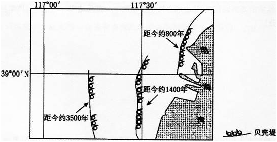 贝壳堤由死亡的贝类生物在海岸带堆积而成。在沿海地区经常分布着多条贝壳堤,标志着海岸线位置的变化。下图示意渤海湾沿岸某地区贝壳堤的分布。 在任一条贝壳堤的形成过程中,海岸线( )。