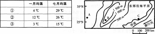 读下面图表完成题。 图中 A、 B、C与表中①、②、③对应正确的是( )。查看材料