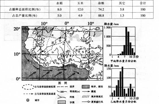 材料一古马里是13世纪~16世纪期间西非草原上繁荣的贸易帝国。下图示意该区域的地理环境。