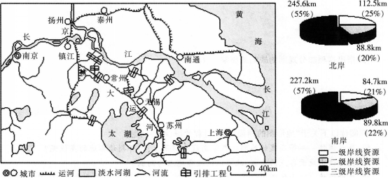 材料一左图为长江下游部分地区略图。右图为长江江苏段岸线资源结构图。岸线资源包括港口和工业生产等所需的相关水域和陆域,一级岸线优于二级,二级优于三级。