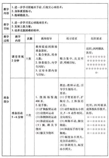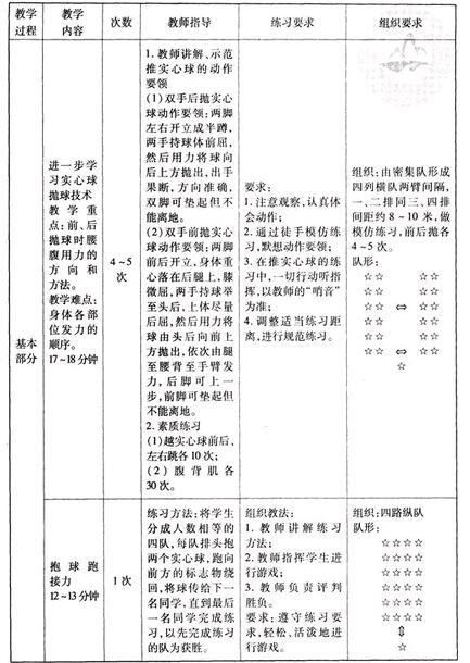 阅读下列材料,设计一节45分钟的课堂教学,清写出基本部分的教学目标、教学方法和教学过程。 教学条件:操场1块,实心球若干。 教学内容:进一步学习原地双手前、后抛实心球技术。第2次课。