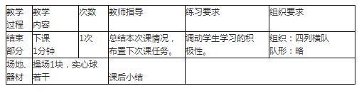 阅读下列材料,设计一节45分钟的课堂教学,清写出基本部分的教学目标、教学方法和教学过程。 教学条件:操场1块,实心球若干。