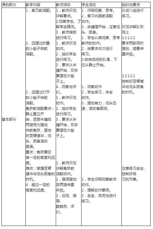 阅读材料,设计一堂45分钟的课程,列举出基本部分的教学目标、教学方法和组织形式。 班级人数:初一学生,40人; 场地:操场; 器材:体操垫; 学习内容:鱼跃前滚翻。