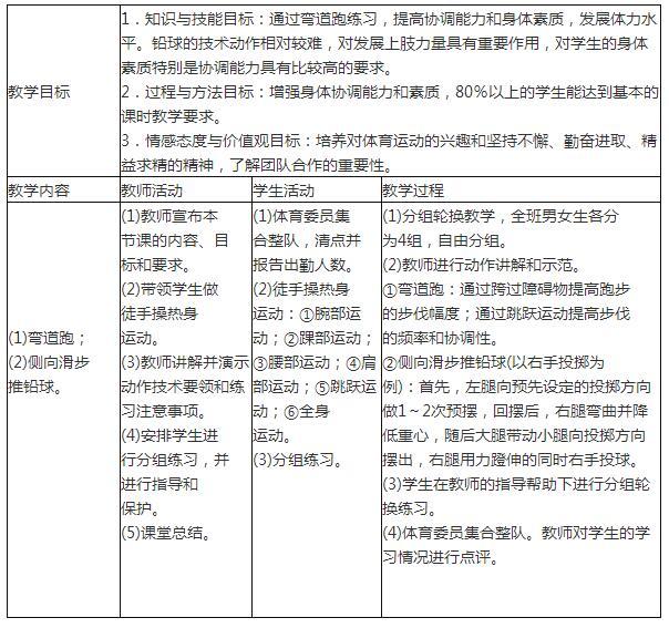 阅读下列材料,根据材料进行简单的教学设计,要求包括教学目标、教学内容、教师活动、学生活动和教学过程。 某初二(2)班学生共40人,其中男生20人,女生20人。 教学内容:弯道跑、推铅球。 器材:铅球。