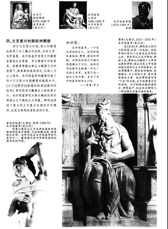 教师引导学生简单介绍文艺复兴的时间及主要思想,并带领学生领略文艺复兴时期的雕塑代表作品,师生一起感受并总结文艺复兴时期雕塑的艺术特色。
