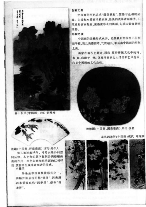 【课题】中国画的形式美 【教学目标】 知识与技能:认识绘画中形式美感与内容的协调统一,了解中国画形式美的形成因素。 过程与方法:通过讲述、欣赏与讨论,能够懂得中国画绘制中运用中国画独特的形式语言,提高对中国画欣赏的审美能力。 情感、态度与价值观:感悟中国画具有的丰富内涵,提升热爱祖国的情怀,培养探索精神和创造精神。 【教学重难点】 重点:赏析中国画的笔墨美感,体验中国画的形式美。 难点:中国画形式美感的体现形式及各因素的价值判断。 【教学方法】欣赏法、讨论法、分析比较法。 【教学准备】 教具:课件、图片、画册。 学具:毛笔、墨汁、宣纸、报纸、国画资料及图片。 【教学过程】 一、看一看 教师播放课件出示课题:《中国画的形式美》(教师板书课题) 二、比一比 教师出示中国传统绘画与西方油画两幅作品,学生分析对比:这两幅作品有哪些不同之处 学生思考回答问题,教师小结:中国画是将诗、书、画、印结合为一体的一门独特的绘画艺术。 (设计意图:通过中西作品的对比,启发学生总结中国画的特征) 三、品一品 教师继续展示图片,与学生共同探讨中国画的形式美。 学生分小组交流讨论,教师参与指导。 1,师生共同品读齐白石作品《虾》《小鸡图》,引导学生思考:中国画的形神之美,美在哪里 学生分组讨论,回答问题,教师小结:中国画的形神之美在于讲究以形写神,形神兼备。表现任何物象“形”似仅仅是手段,神似才是目的。 2,教师出示潘天寿的作品《露气》《万山红遍》以及王希孟的作品《千里江山图》,并以中国画的形象之美为例,逐一品读中国画的笔墨之美与色彩之美分别美在什么地方。 学生讨论,由小组代表回答问题: ①中国画的笔墨之美:以线为主的表现方法,造型概括,风骨遒劲,用笔果断老练,画面苍茫厚重。 ②中国画的色彩之美:以画法分有白描、水墨淡彩、重彩、没骨、勾勒填彩、泼墨泼彩等。构成了中国画独特的民族特色。 教师总结补充学生答案。 (设计意图:展示作品,通过学生欣赏和讨论,进而引导学生懂得中国画美在哪里,提高学生对中国画的欣赏能力) 3,品读章法多样的国画作品。 教师提示学生研读教材,并提出问题:中国画的形制和布局分别是怎样的 学生阅读教材总结答案,了解中国画的章法之美: ①中国画的形制:扇面、册页、长卷、立轴、条屏、框裱等。 ②中国画的布局:题款、印章、留白等。 四、练一练 1,教师提出作业要求:以家乡美为主题进行绘画创作。 利用多媒体展示家乡美的图片若干,引导学生进行创作。 2,学生绘画,教师巡回辅导。 (设计意图:鼓励学生大胆创作,培养学生探索精神和创新精神) 五、评一评 各小组同学分别展示优秀作品,并派作者阐述创作主题、意图及创作原因,评说作品意境美。教师做最后评述。 六、课堂小结 师生通过问答方式回顾一节课的重点内容,并引导学生要热爱我国民族文化艺术,提高美术素养。
