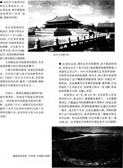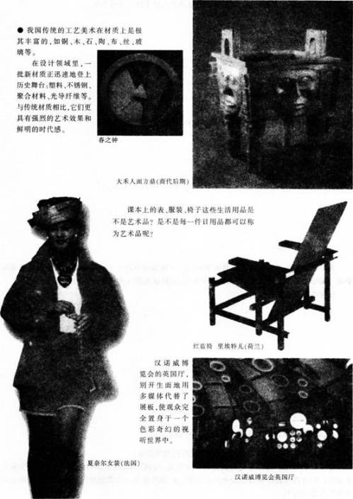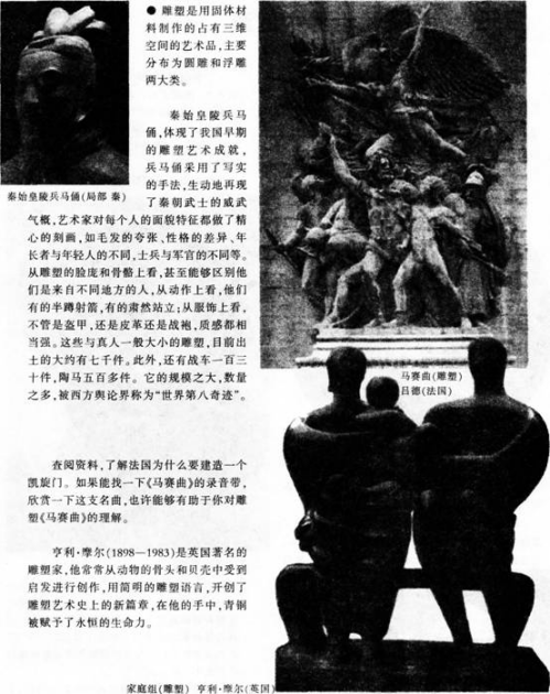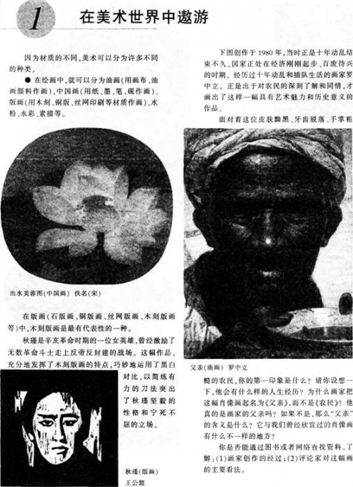 【课题】《在美术世界中遨游》 【课型】新授课 【课时】1课时 【教学目标】 (1)知识与技能:了解美术的分类,掌握对各种美术作品造型方式、表达方式和形式美感的赏析技能。 (2)过程与方法:通过大量美术作品的欣赏。教师正确引导,对中西作品分析比较,让学生在了解美术的基础上对美术有一个清晰的认识,并能够正确掌握美术作品分类,学会用新型的美术材料来体现美。 (3)情感、态度与价值观:通过对美术作品的分析评价,让学生了解美术作品是人类的宝贵财富,培养学生对美术学习的兴趣。让学生打破时空,不拘一格地在美术世界中寻找美,发现美,从而创造美。 【教学重点】 让学生对各种美术作品的造型方式、表达方式和形式美感进行了解和掌握,从而进行对美术作品制作材料的分析比较。 【教学难点】 具体分析、理解本节课所学的内容,使学生能够独立、正确地理解美术作品所用材料的不同而带来的不同画面效果。 【教学方法】 讲授法、讨论法、创设情景法。 【教学用具】 多媒体、课本。 【教学过程】 环节一:组织教学 教师准备好上课所需教具,维持课堂秩序,师生常规性互相问好,准备上课。 (设计意图:组织教学,学生能够安静下来,进入学习的状态) 环节二:激趣导课 以问题激发学生: ①你们见过哪些美术作品 ②它们的材质分别是什么呢 并以展览的形式把老师和学生课前收集的图片布置在教室的墙壁上,让学生带着问题互相欣赏,向学生展示美术世界的丰富多彩,由此引出课题。 (设计意图:为学生创设一种置身于美术作品之中的氛围,引起学生的学习兴趣) 环节三:讲授新知 ①欣赏课本上的图片,提出问题:如图《父亲》《秋瑾》,“同样是画人物,它们有什么不同 ”让学生在思考探究中对本节课所学的内容产生好奇,感受不同材质带来的不同效果。 ②在学生思考的同时给学生准备一些不同种类的绘画工具,像国画工具、油画工具、水彩画工具以及其他种类的绘画工具给学生看。让学生能正确地判断出美术作品是用哪些绘画工具完成的。教师小结:美术的四大主要门类有:绘画、雕塑、建筑、工艺美术。绘画又包括中国画、油画、水彩画、版画等。 ③教师首先充当导演,让学生在游戏中,一边看作品,一边正确地找出作品使用的材料。让学生甲指出油画《父亲》,学生乙找出油画用的材料;学生甲出示卡片“浮雕”,学生乙找出书上图片中的浮雕;学生甲出示“水彩画”的卡片,学生乙就要从课本外找出一张水彩画的作品。让学生在游戏中分清楚作品是用什么材料完成的。 然后,回到课本上的图片,具体地分析每幅作品。由于材质的不同,使得美术作品效果截然不同。以学生的探究为主,教师适当地加以补充。 ④为了检验学生掌握知识的程度,教师又从课本之外找了一些不同种类的图片,让他们做出比较。 (设计意图:在这一环节,主要让学生通过对图片的大量欣赏比较,自己体验美术作品由于材质的不同所带来的不同效果) 环节四:思考讨论 了解美术四大类后。教师继续让学生对刚才所观看的图片进行讨论: 《家庭组》和《马赛曲》同样是雕塑,表现手法不同,效果有什么不同 通过《出水芙蓉》《天坛祈年殿》看出中国画与中国古建筑之间有什么联系 在探究欣赏比较中让学生了解本节课的学习内容,掌握不同材质的基本特点。 (设计意图:在整个教学过程中,通过课外的探索与发现,学生能对本节课有一个整体的认知与提高) 环节五:展示评价 学生积极主动表述关于上述两个提问的想法,同学互评,教师小结。 (设计意图:展现自己,巩固新知,共同发现知识点遗漏部分) 环节六:教师总结 本节课通过对图片的大量欣赏,让学生在了解美术的四大门类中,感受祖国那份几千年来沉甸甸的美术文化。学生通过对美术作品直接的感受,引导学生观察作品,让学生看出不同画种的不同效果。使学生能够独立、正确地从美术作品中,按工具材料的不同认识美术作品的门类。 (设计意图:加深对整个教学过程的印象和体验,同时又是对整节课的总结和梳理) 环节七:课后拓展 教师引导学生关注生活中的新材料、新美术,将美术的学习空间和生活紧密联系在一起。 (设计意图:有助于学生形成热爱美术、热爱生活的思想情感) 【板书设计】 在美术世界中遨游 美术的四大主要门类有:绘画、雕塑、建筑、工艺美术。 绘画:中国画、油画、水彩画、版画等。 【教学反思】()